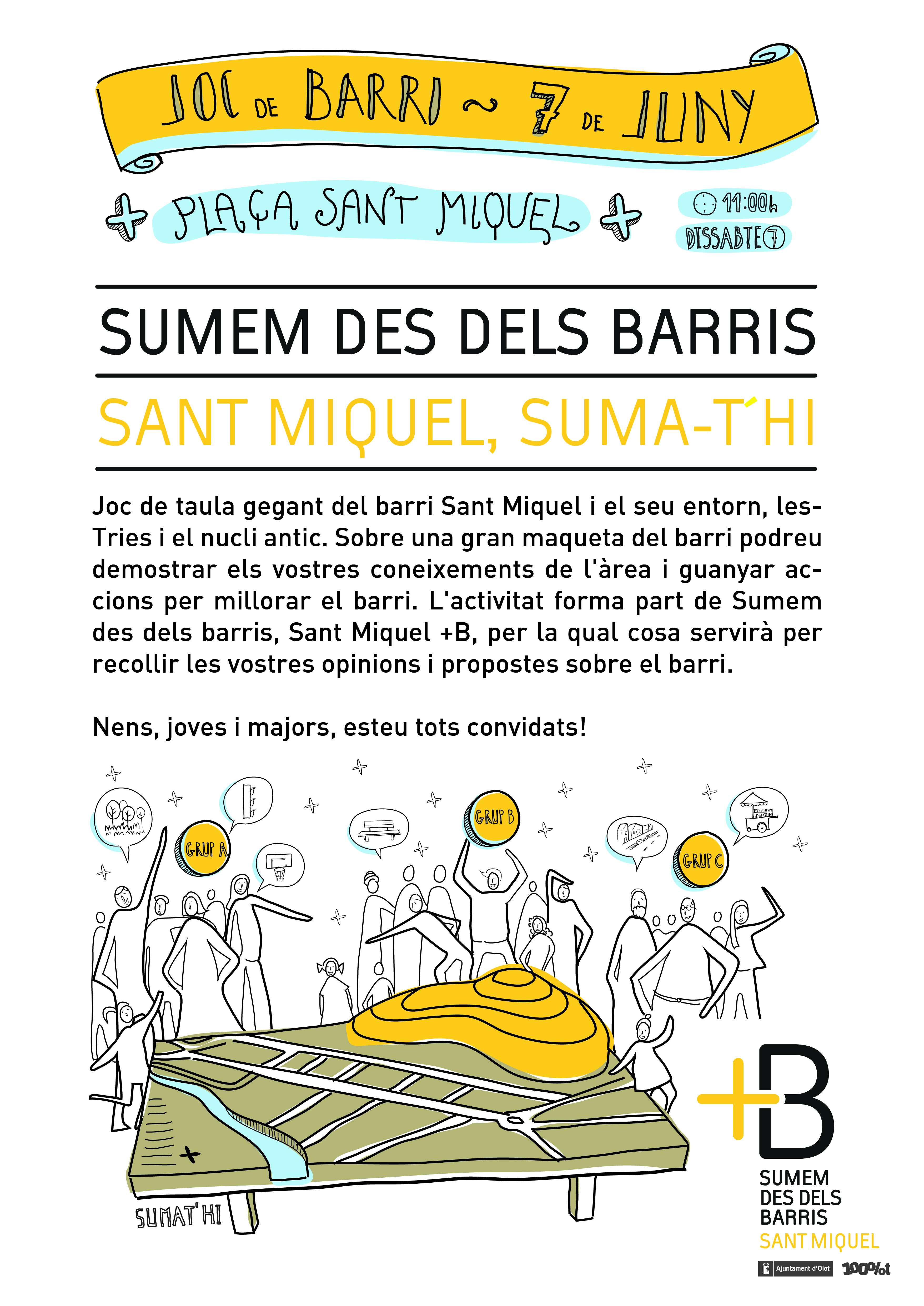 Dissabte que ve 7 de juny tindrà lloc, a la plaça de Sant Miquel, la primera activitat participativa del projecte +B, Sumem des dels barris. Aquest primer esdeveniment serà el Joc de Barri, una activitat lúdica i pedagògica l’objectiu principal del qual és generar comunitat entorn del projecte Sant Miquel +B, i, també, que reconeixem els principals elements de valor del barri –els seus espais significatius i els seus elements d’identitat, les persones i els esdeveniments que li atorguen caràcter- i comencem a recollir les idees de millora que proposin els veïns.