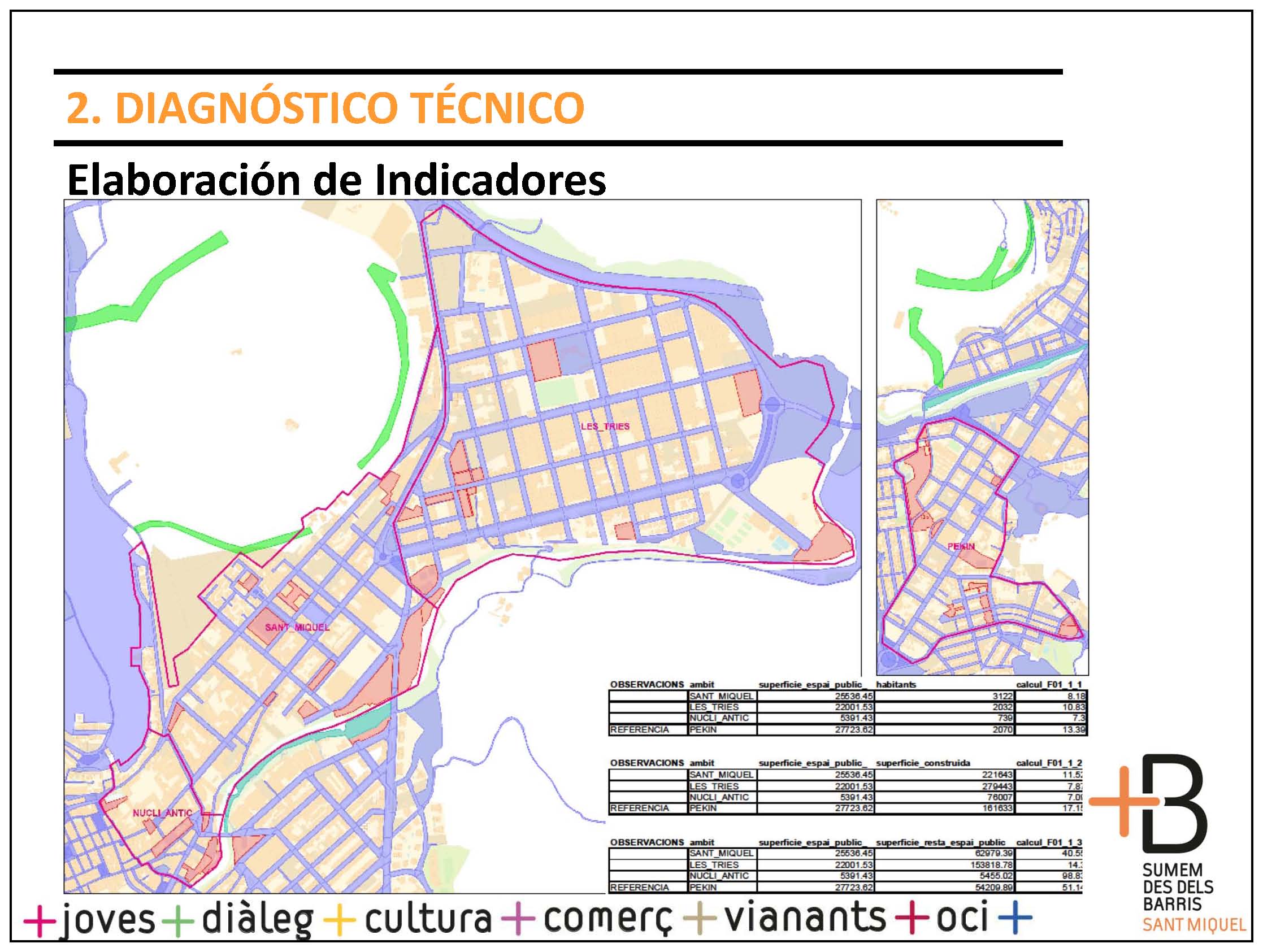 Sant Miquel +B s’ha planejat des d’un inici com un procés que vol escurçar la distància entre les necessitats ciutadanes i els condicionants tècnics amb l’objectiu de plantejar estratègies comunes i aconseguir solucions compartides. És per això que el diagnòstic participatiu s’ha desenvolupat a partir de l’eina d’indicadors participatius que permet analitzar de manera simultània les percepcions ciutadanes i les qüestions tècniques. Posteriorment es planteja una sèrie de temàtiques d’encreuament que permeten lligar tots dos mons, i que engloben les matèries prioritàries sobre les quals es treballarà en la segona fase.