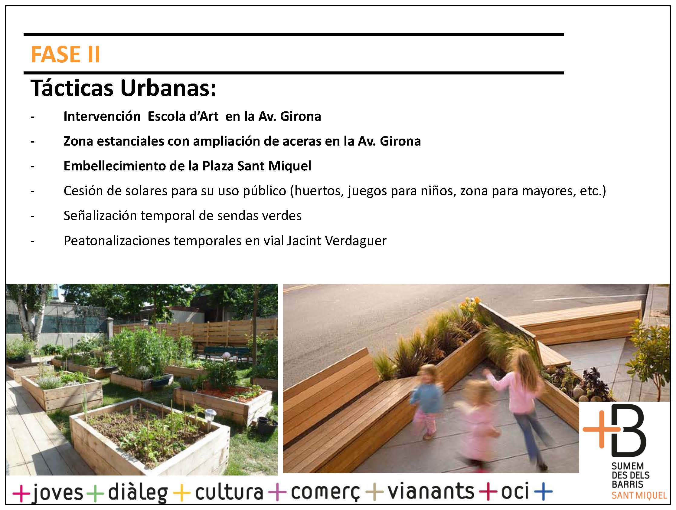 Paral•lelament, durant aquesta segona fase es duran a terme dues intervencions tàctiques, associades a cadascuna de les línies estratègiques. Dins de la primera, es realitzarà una intervenció d’embelliment de la plaça de Sant Miquel, que en millori la imatge urbana i atorgui valor a un espai de gran importància al barri. Dins de la segona línia, la tàctica urbana s’enfocarà a una acció de dinamització a l’avinguda de Girona que en potenciï els valors com a espai d’accés a Olot i com a eix d’activitat del barri. Aquestes dues tàctiques es realitzaran en col•laboració amb l’Escola d’Art d’Olot, com a inici d’una relació que considerem summament important per al futur.