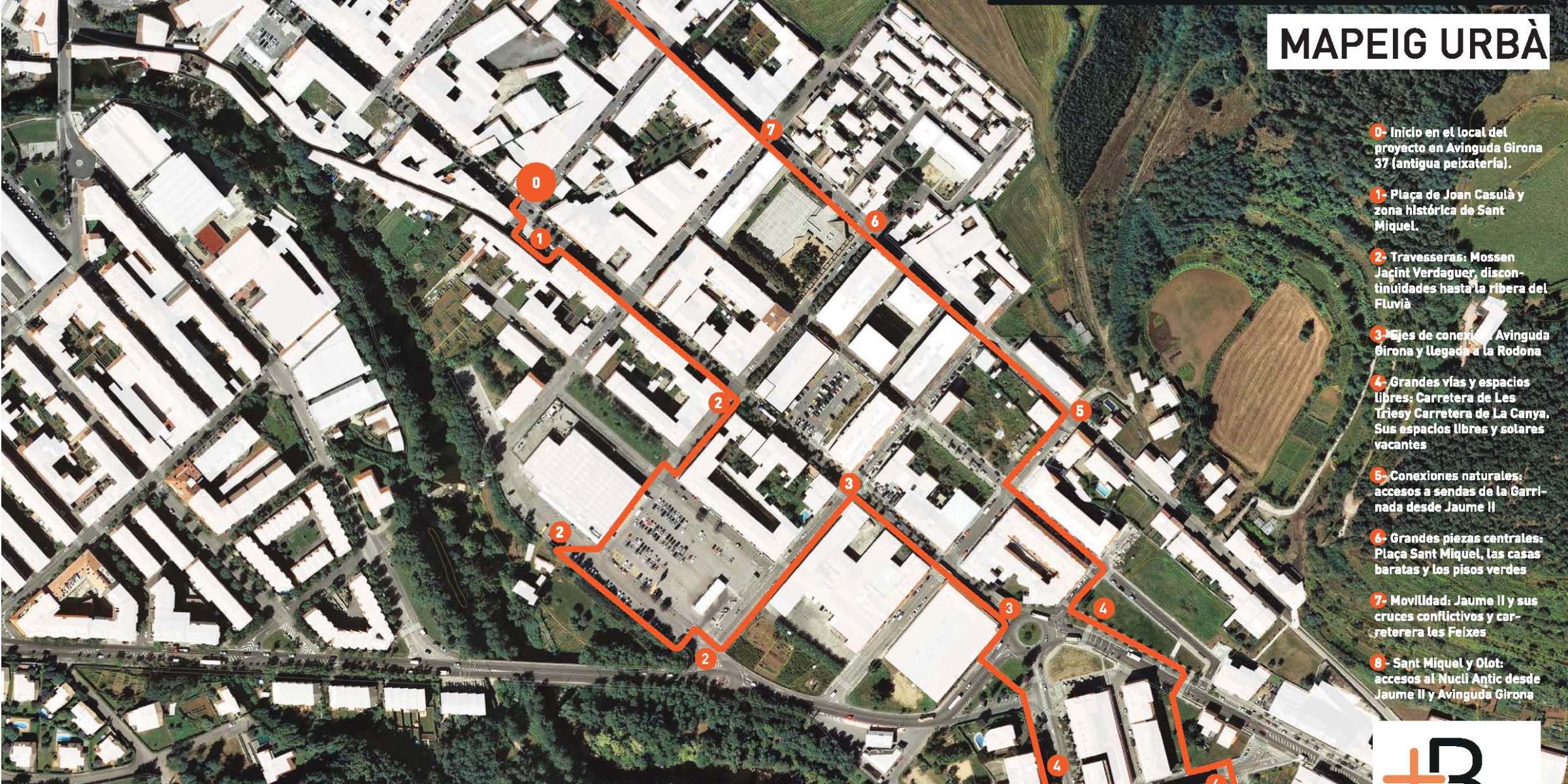 El recorregut va començar en l’espai del projecte a l’avinguda de Girona, lloc des del qual ens traslladem a la primera fita del recorregut. La plaça de Joan Casulà és un petit espai públic al costat de l’avinguda de Girona que dóna accés a la zona històrica del carrer de Sant Miquel, un espai que, malgrat la seva posició privilegiada, no té un ús clar i que presenta problemes d’accessibilitat. La contigüitat amb l’avinguda de Girona el converteix en un espai amb un nivell elevat de soroll, poc apte per a l’esplai, i l’estat de conservació dels habitatges circumdants no ajuda a generar una imatge atractiva. En realitat, tot el conjunt de la plaça i el carrer de Sant Miquel pateix un cert estat d’abandonament provocat en part per veure’s afectat pel Pla general, que plantejava una operació de continuar la ronda de Sant Miquel per diverses d’aquestes parcel•les.