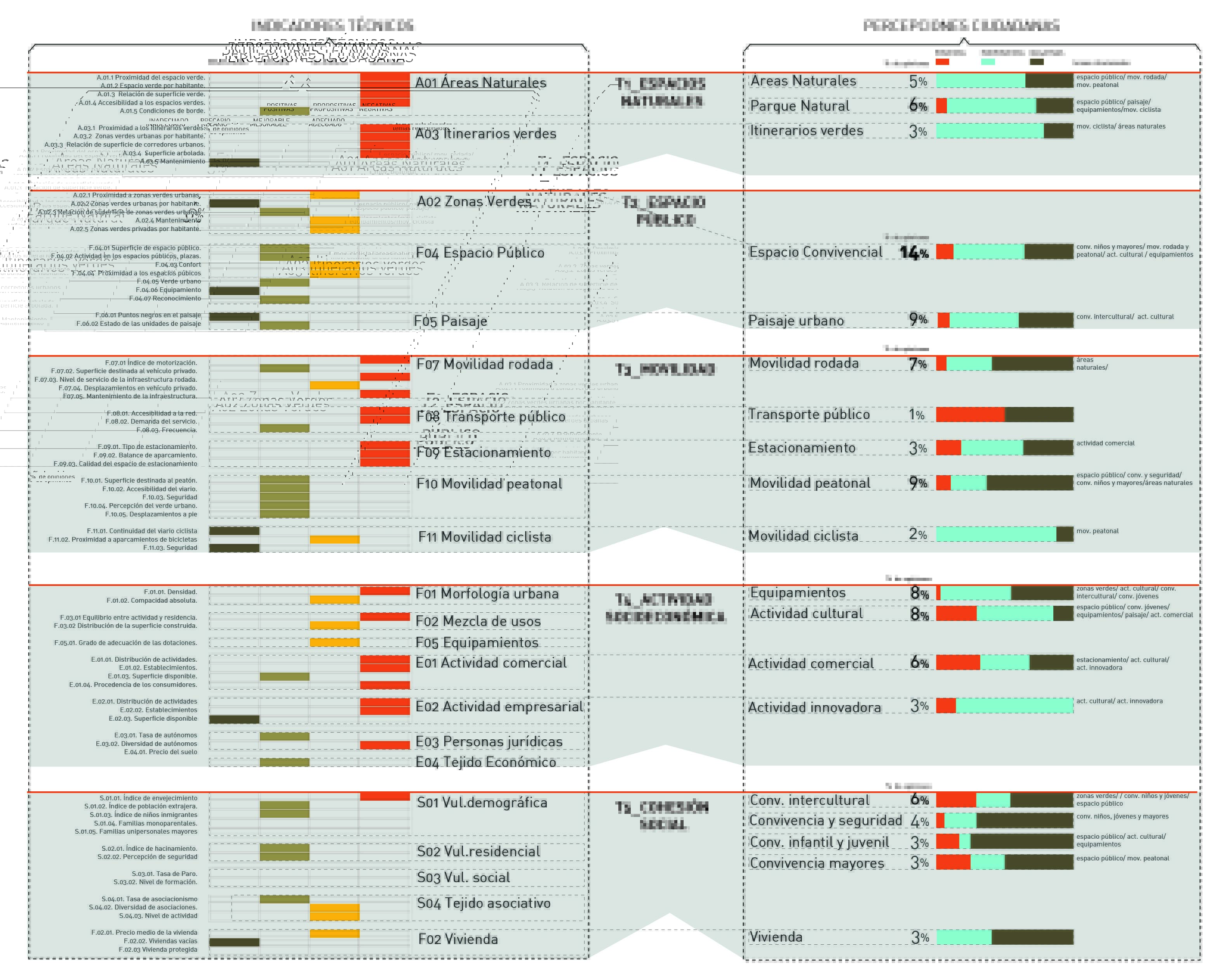 Tant els indicadors de les zones verdes urbanes com els indicadors d’espais de convivència (places) destaquen per no arribar al valor òptim i per estar per sota dels valors del barri de referència, Pequín. Els aspectes més febles són la superfície de zones verdes i d’espai convivencial per habitant, així com l’equipament d’aquestes zones per als diferents col•lectius: nens, joves i gent gran. En l’espai públic s’inclou el paisatge urbà, els indicadors del qual són molt vulnerables, principalment per l’impacte de solars i façanes descurats i per la falta de conservació d’alguns dels elements paisatgístics del barri. Així doncs, els indicadors confirmen les intuïcions ciutadanes sobre la falta d’espai convivencial i respecte a la necessitat d’embellir i fer més verd el barri.