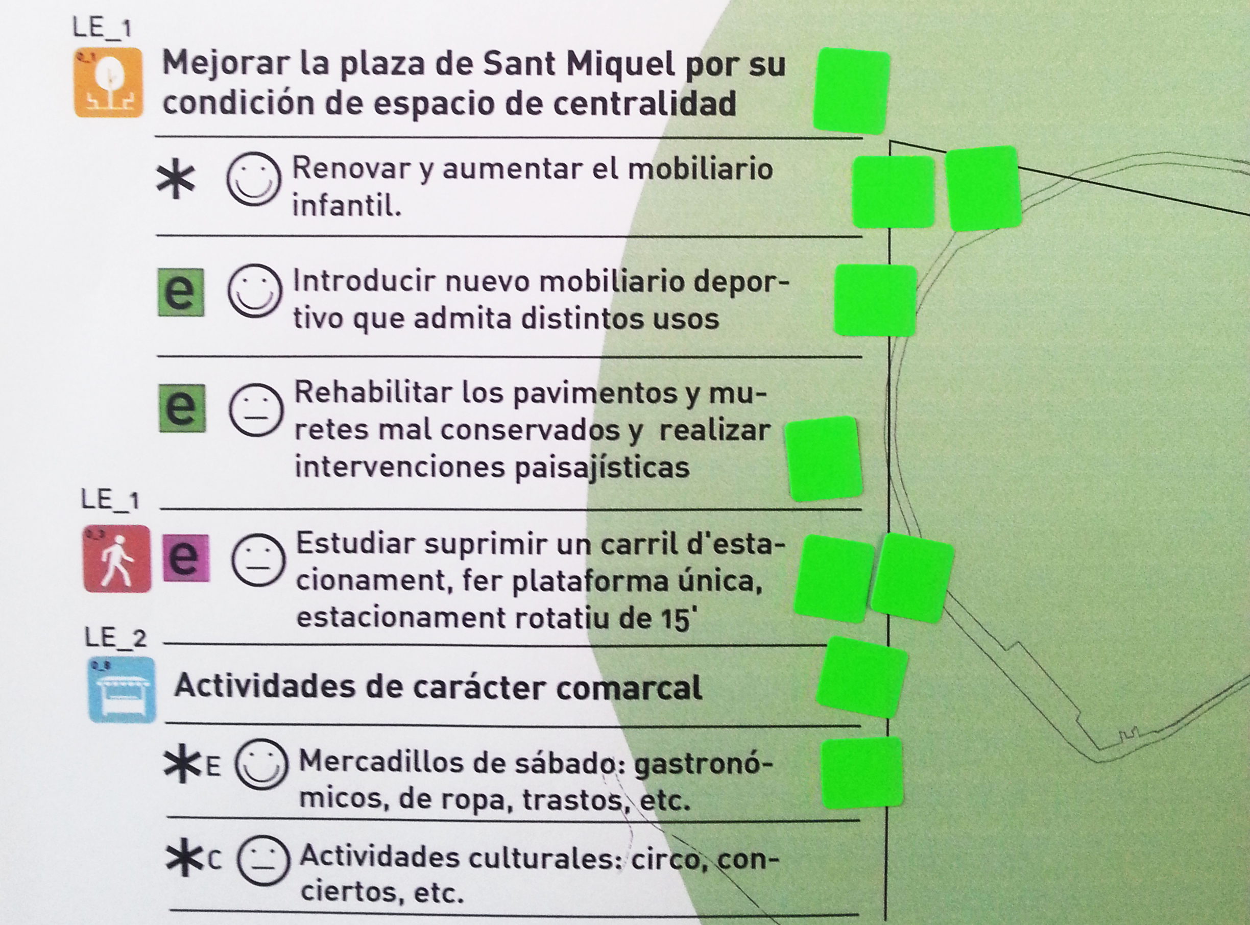 Amb aquest objectiu, i a manera d’element central del procés participatiu en aquesta segona fase, va tenir lloc el dissabte 25 d’octubre un taller col•laboratiu amb ciutadans i tècnics municipals amb l’objectiu de valorar i prioritzar les 46 propostes sorgides fins al moment. Per generar una dinàmica àgil i efectiva en una labor que podia resultar complicada, es va optar per una agrupació de les propostes en una sèrie d’àmbits estratègics: l’espai *intervolcànic, l’avinguda Girona, el Fluvià i les tres peces de centralitat del barri: plaça de Sant Miquel, el Casal i mas Les Mates. A més, aquesta estructura va permetre el treball de la part final de la dinàmica, orientat a valorar per on comencem a actuar.